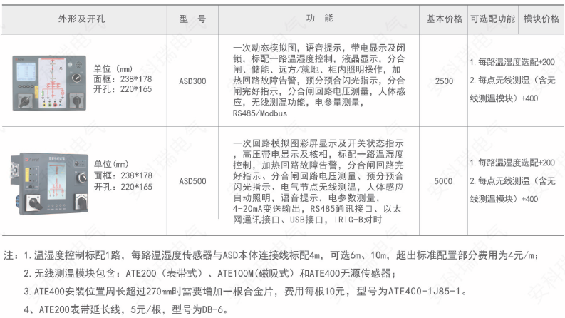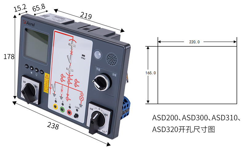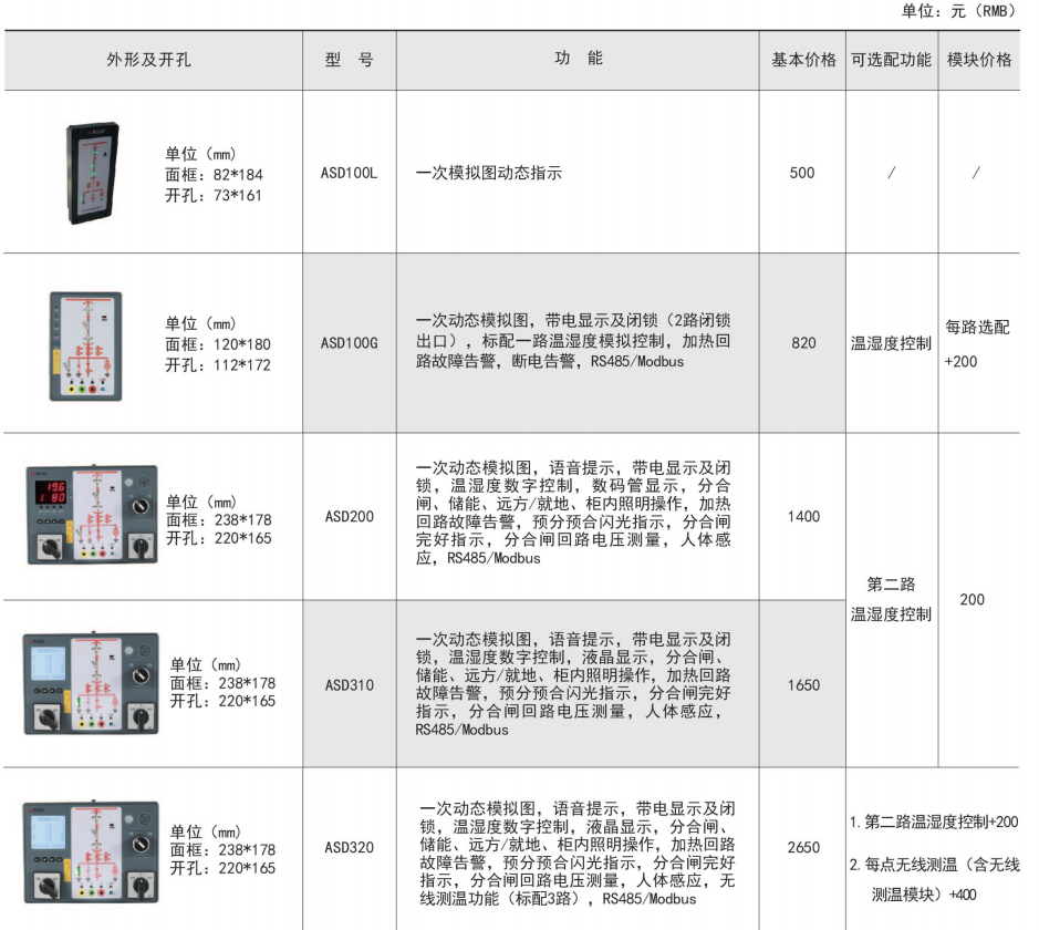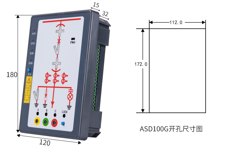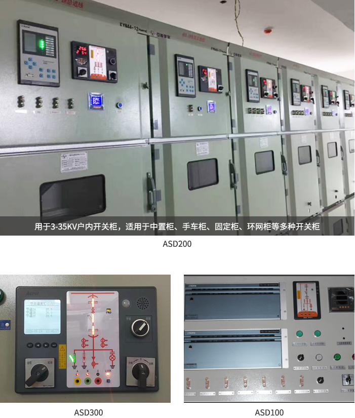 ASD系列開關柜綜合測控裝置具有一次回路模擬圖及開關狀態指示、高壓帶電顯示、自動溫濕度控制、人體感應自動照明、語音提示、電參數測量及RS485通訊接口等功能,集操作、顯示于一體,直觀地體現柜內元件的工作狀態及工作環境。