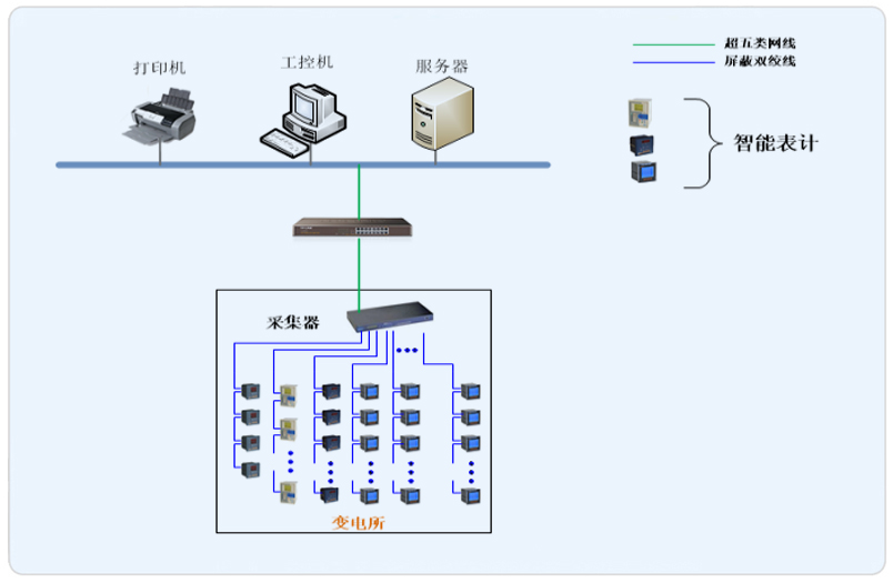 系統采用Acrel-2000型電能管理系統,整個系統采用網絡分布式結構,監控主機位于變電所內值班室,變電所內配置一套采集設備進行數據的采集,所有配電回路均配備智能儀表。該項目實現了安國酒店變電所的配電回路重要數據的實時采集,存儲,顯示。所有監控設備均通過屏蔽雙絞線連接至采集箱的通訊采集器,再通過網線將數據傳輸至系統主機,從而實現電力監控系統的整體搭建。