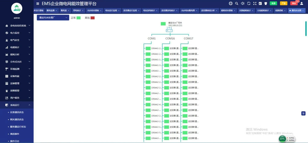 嘉定污水處理廠EMS電能管理系統項目分為三個低配間,兩個箱變和光伏設備,做到數據互通,電力數據實時顯示在電力一次圖上面。