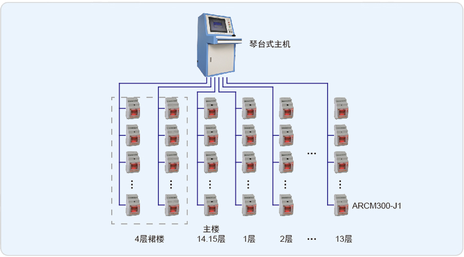 現(xiàn)場共有ARCM300-J1剩余電流式儀表280只,分別分布于15層主樓和4層裙樓樓層內,現(xiàn)場火災探測器采用總線方式接至位于主樓1層消防控制室內的 Acrel-6000琴臺式電氣火災監(jiān)控系統(tǒng)。