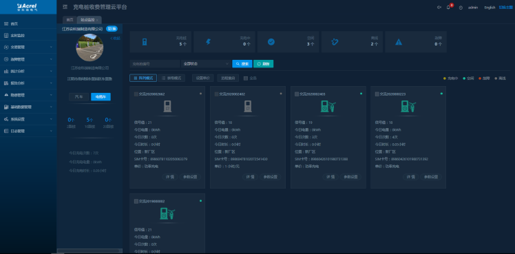 | 遠程充電樁電能管理系統 | Acrel-9000 | (一)資源管理 充電站檔案管理,充電樁檔案管理,用戶檔案管理,充電樁異常交易監測 (二)交易結算 充電價格策略管理,預收費管理,賬單管理,營收和財務相關報表 (三)用戶管理 用戶注冊,用戶登錄,用戶帳戶管理 (四)充電服務 充電設施搜索,充電設施查看,地圖尋址,在線自助支付充電,充電結算,導航等 (五)微信小程序 掃碼充電,賬單查詢、充電信息監測等功能 (六)數據服務 數據采集,數據存儲和解析 (七)收益隔天結轉到帳 |