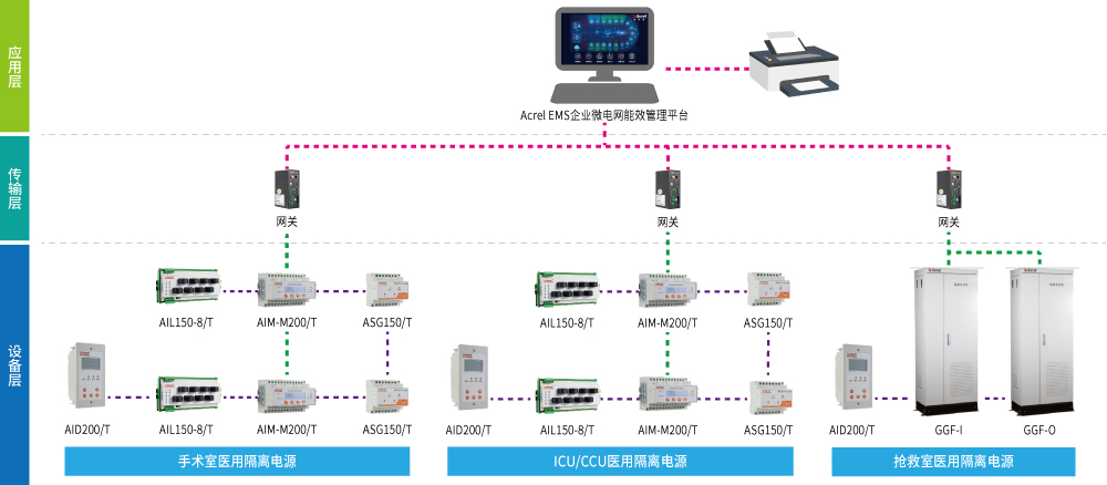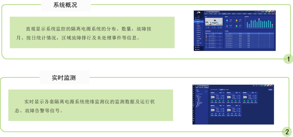 醫(yī)用隔離電源監(jiān)控系統(tǒng)用于集中監(jiān)控醫(yī)院門急診樓、住院樓內(nèi)所有醫(yī)療2類場所醫(yī)用隔離電源系統(tǒng)的運(yùn)行狀態(tài),實(shí)時監(jiān)測各系統(tǒng)的絕緣狀況、負(fù)載率及變壓器的運(yùn)行溫度。一旦某套隔離電源系統(tǒng)出現(xiàn)故障,能發(fā)出報(bào)警信息,提醒工作人員及時排查故障,消除隱患,保障各醫(yī)用隔離電源的安全可靠運(yùn)行。