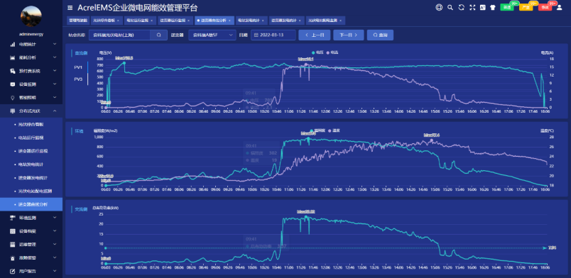 展示逆變器直流側(cè)電壓、電流曲線,交流側(cè)功率曲線以及環(huán)境輻照度曲線、溫度曲線。便于用戶進(jìn)行整體分析。