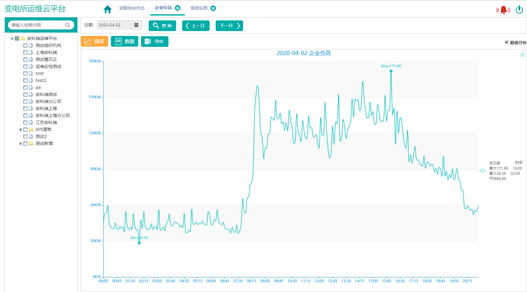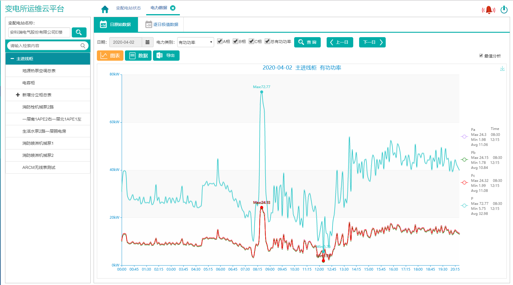 電力數據顯示選定變電所選定回路的電力數據和曲線,包括電流、相電壓、線電壓、頻率、功率因數、有功功率、無功功率、視在功率、電壓、電流不平衡度等參數,曲線顯示統計期內大、小、平均值,并支持導出圖表;方便用戶通過表格查詢數據