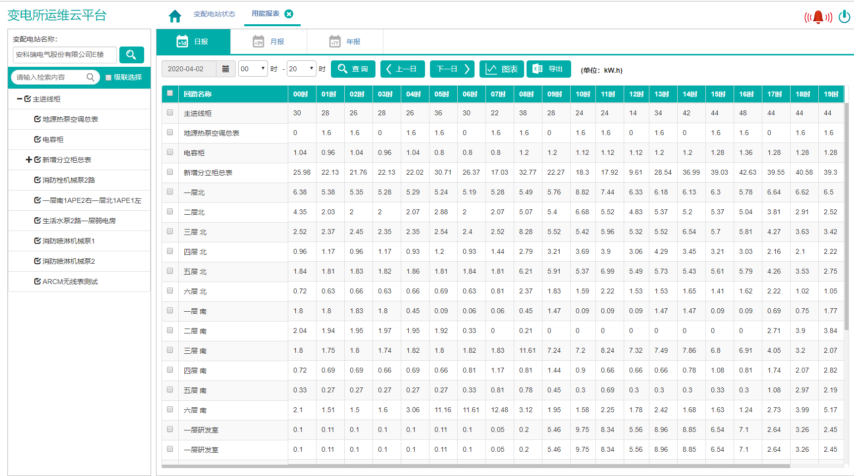 用能報表顯示各回路的用能數據,包括日報、月報、年報,日報顯示分時用能,月報顯示分日用能,年報顯示分月用能,報表可以導出。