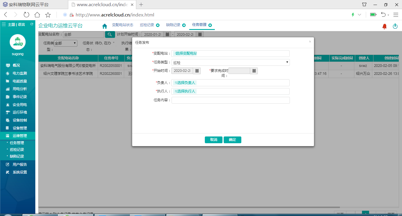 運維管理包括任務管理、巡檢記錄、缺陷記錄三部分,其中任務管理可以完成任務的創建、發布、任務完成情況查詢;巡檢記錄是巡檢任務的執行情況和執行明細,缺陷記錄是消缺任務創建、發布、完成狀態情況查詢。