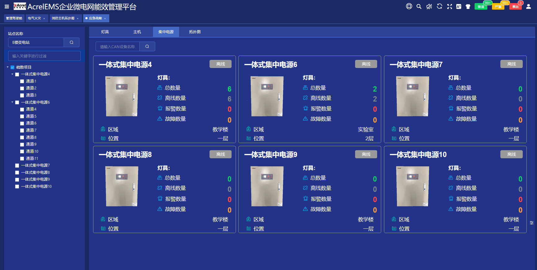應急照明集中電源是安裝在建筑物內的備用集中式集中電源裝置。集中電源可以為消防標志燈、照明燈供電,保證消防應急照明和疏散指示系統正常工作,軟件可分布式顯示現場實際集中電源各類信息和狀態。