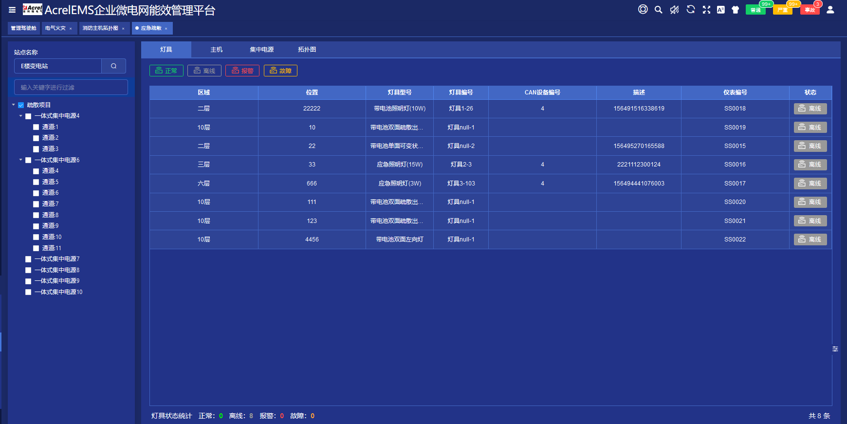 消防應急標志燈具的主要作用是為人員疏散指引方向,消防應急照明燈具的主要作用是為人員疏散逃生提供照明,軟件可實時顯示現場燈具的狀態信息。