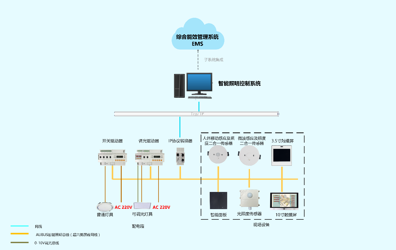 系統(tǒng)在照明配電箱內(nèi)的模塊主要有開關驅動器、IP網(wǎng)關、路燈控制器、時間控制器、干接點輸入模塊等。這些模塊使用35mm標準導軌安裝。另外安裝在控制現(xiàn)場的模塊主要有光照度傳感器、紅外傳感器和智能面板。有人經(jīng)過可以設定紅外感應控制亮燈,人離開后在設定的時間內(nèi)熄燈,智能面板等手動控制設備,可實現(xiàn)自動控制、現(xiàn)場控制和值班室遠程控制相結合。