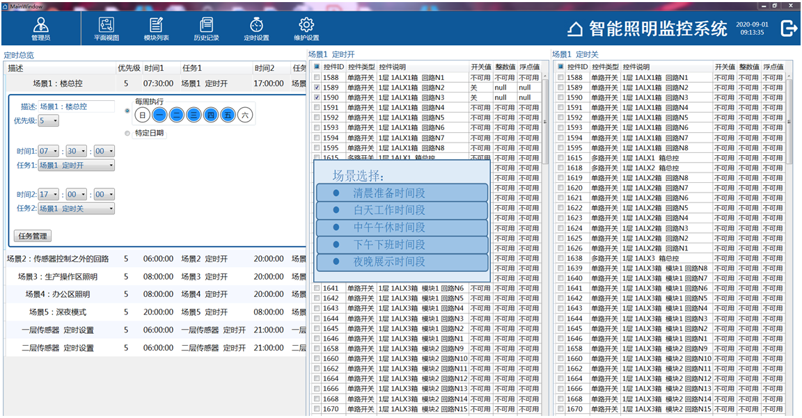 可以通過電腦或者觸控終端控制一棟樓、某一層或某個區(qū)域所有照明燈具開關。可以對單個照明回路實現(xiàn)開關控制,還可對每個模塊、箱子、樓層、自定義分區(qū)實現(xiàn)總控。現(xiàn)場受控回路的開關狀態(tài)會實時反饋。