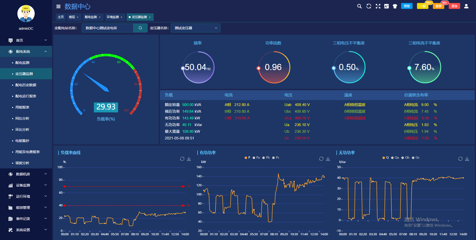 變壓器監(jiān)測監(jiān)測頁面實時監(jiān)測各變壓器各項參數(shù),包括福賊率。頻率,功率因數(shù),三相不平衡度等,并且顯示歷時曲線圖,數(shù)據(jù)實時變化。幫助用戶直觀監(jiān)測各變壓器運行狀態(tài)。