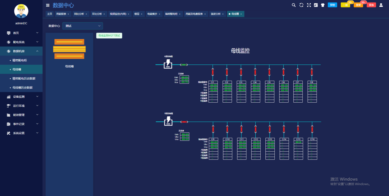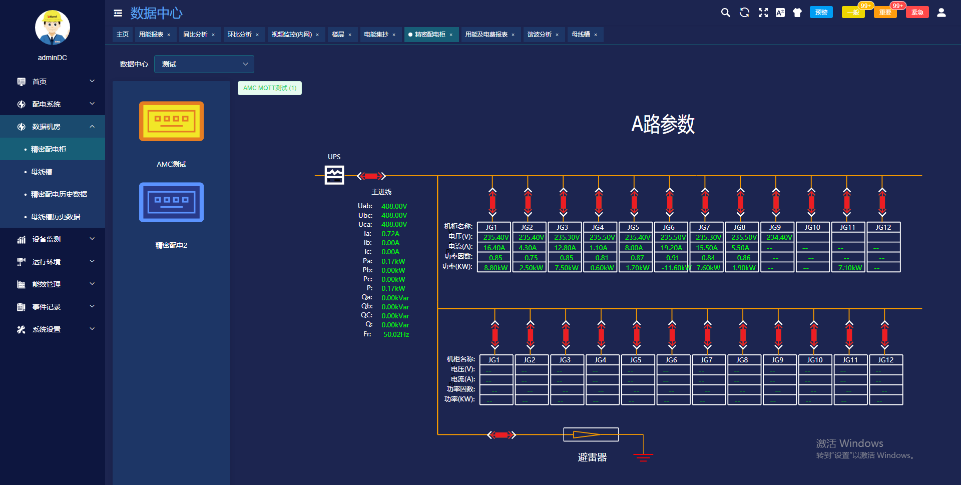 精密配電柜,通過SVG圖,將所有機柜的電壓,電流,功率,功率因數(shù)等參數(shù)顯示在圖中。