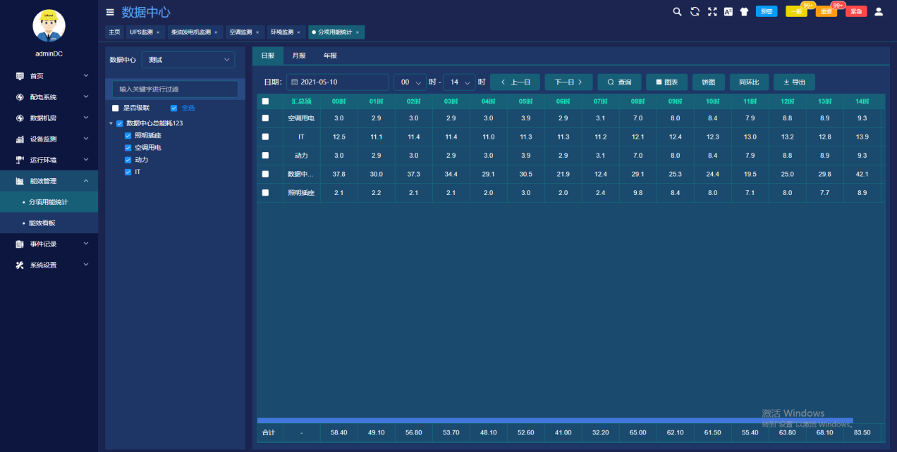 顯示當前數(shù)據(jù)中心,IT、空調(diào)、照明動力用電各時段的用電情況。