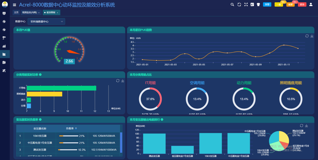 能效看板實時顯示當前數(shù)據(jù)中心PUE值以及歷史PUE曲線。并且顯示各分項用能的用能情況及用能排行。監(jiān)測各變壓器運行及負載情況,給出本月變壓器輸出電能排行。