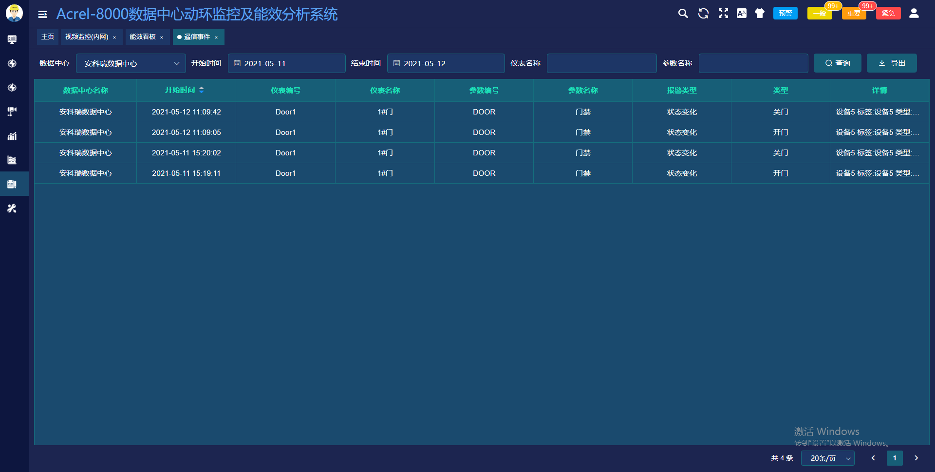 顯示當前數(shù)據(jù)中心各遙測量、如門禁、煙霧、水浸等狀態(tài)變化的報警情況。