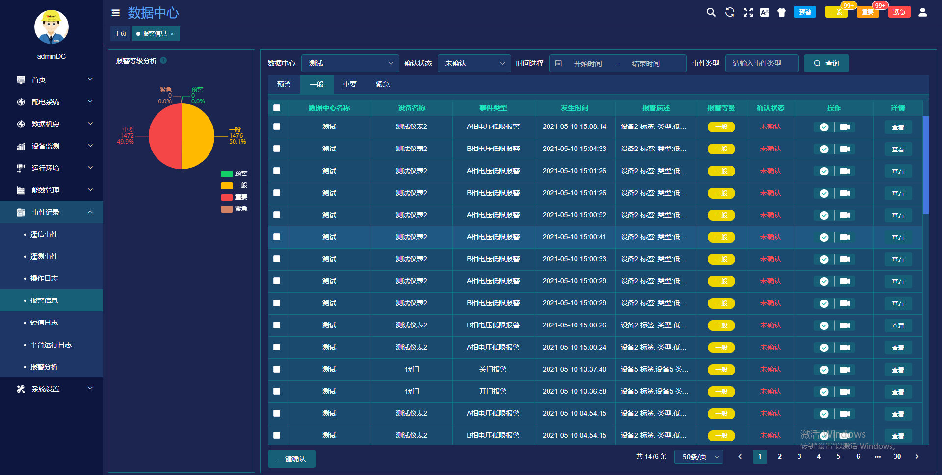 顯示當前數(shù)據(jù)中心下各報警的確認狀態(tài),幫助用戶確認當前數(shù)據(jù)中心的運行狀態(tài)。提醒用戶有哪些存在的安全隱患。