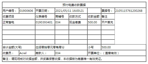 售電、退電、開戶時系統(tǒng)支持三聯(lián)單單據(jù)打印的功能,單據(jù)格式默認如下(可以由客戶確認后自由定制):