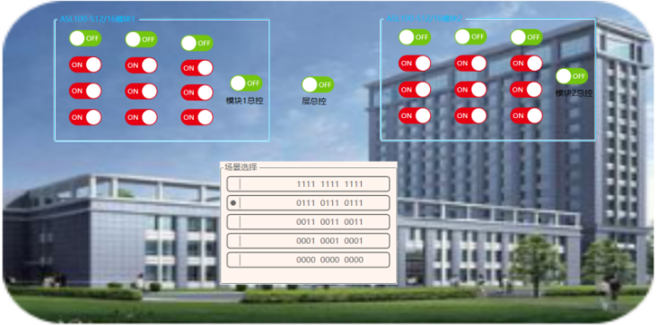 可以通過電腦或者觸控終端控制一棟樓、某一層或某個區(qū)域所有照明燈具開關。可以對單個照明回路實現開關控制,還可對每個模塊、箱子、樓層、自定義分區(qū)實現總控。現場受控回路的開關狀態(tài)會實時反饋。