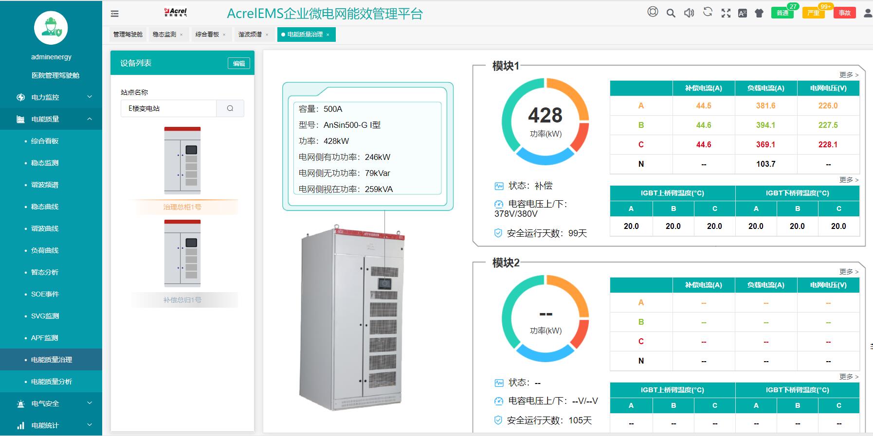 為了消除配電系統(tǒng)諧波對(duì)配電系統(tǒng)設(shè)備的影響,方案配置安科瑞AnSin有源濾波器和AnCos有源無功補(bǔ)償裝置,濾除電網(wǎng)2~31次諧波干擾,提高系統(tǒng)功率因數(shù)。