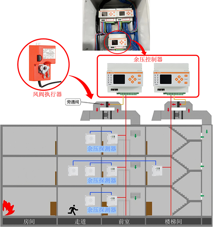 實時數據監測系統通過余壓探測器持續采集疏散通道與相鄰區域(如走道)的壓力差數據,確保壓力值穩定在國家規范要求的范圍內。